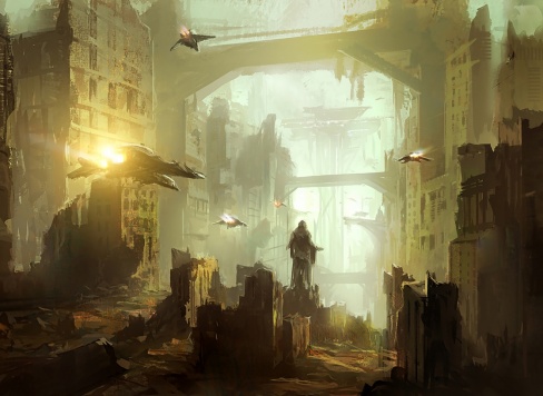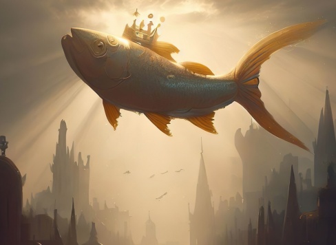 ‘Ortaçağdan kalma bir şehir meydanının ortasında, taç takmış dev bir balık havada uçarken altın, mavi ve yeşil renklerde parlıyor. Balığın altından bir nehir akıyor ve güneş ışığı sudan ve taş döşemeden yansıyor. Sahne, kış mevsiminde kar ve kuşlarla birlikte gün doğumunu tasvir etmektedir. Bu görüntü, Paris ve İstanbul'un unsurlarını, grinin tonlarında bir zenginlik ve insan sonrası/gerçek sonrası temalarıyla birleştiriyor.’